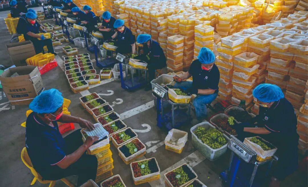 2023年8月19日,由湖南援建的吐鲁番市富鹏种植专业合作社,工人忙着将无核紫、无核白、玻璃脆三种葡萄分拣在同一个打包盒里,通过电商和冷链销往全国各地。湖南日报全媒体记者 郭立亮 摄