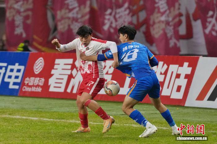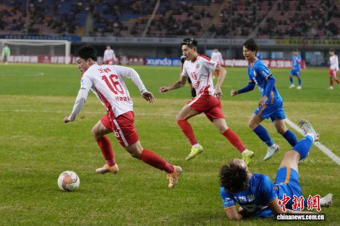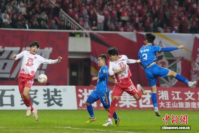 湘超联赛,湖南足球联赛,湘超赛程,湘超直播,湘超积分榜,湘超球队/湘超联赛为湖南足球迷提供最新赛程、实时比分、积分榜排名、球队信息和直播入口,掌握最新赛事动态,畅享足球激情。12月14日晚,2025湖南省足球联赛淘汰赛四分之一决赛在长沙进行,长沙队主场2:0击败岳阳队,成功晋级四强。图为长沙队员李悦宁(右一)射门。中新社记者 杨华峰 摄