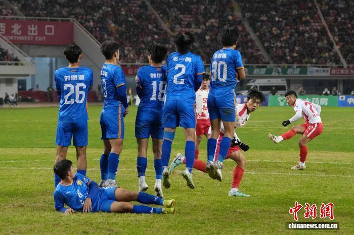 12月14日晚,2025湖南省足球联赛淘汰赛四分之一决赛在长沙进行,长沙队主场2:0击败岳阳队,成功晋级四强。图为长沙队员陈琪(右一)任意球射门。中新社记者 杨华峰 摄