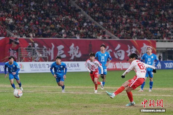 12月14日晚,2025湖南省足球联赛淘汰赛四分之一决赛在长沙进行,长沙队主场2:0击败岳阳队,成功晋级四强。图为长沙队63号姜承坤点球破门。中新社记者 杨华峰 摄