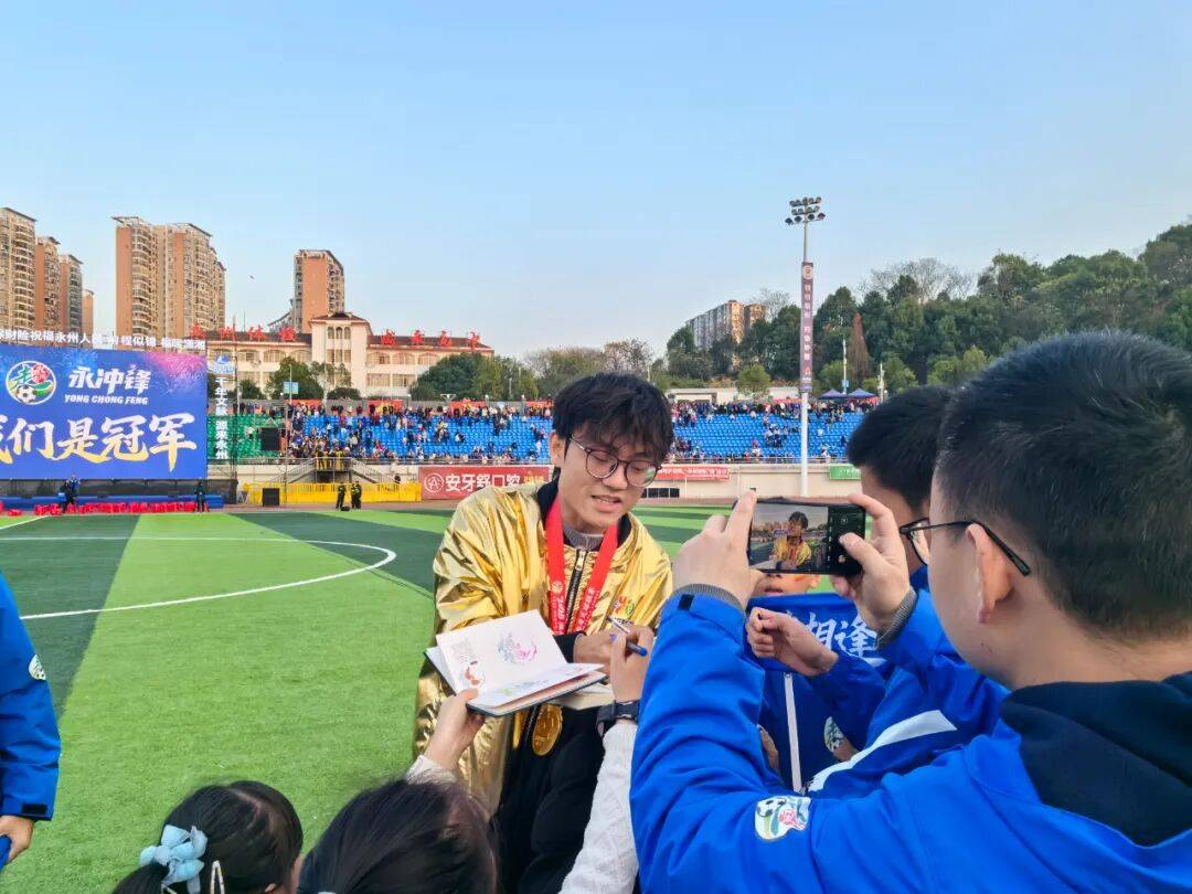 在庆祝活动中,永州市委市政府主要领导给7位非永州籍球员颁发了“永州荣誉市民”奖章。在这7位帮助永州夺冠的外地功臣中,有一位叫高响的球员,在今年的湘超联赛中一共打进7个球,是永州队内的“射手王”,很多球迷在球场、酒店追着他要合影和签名。