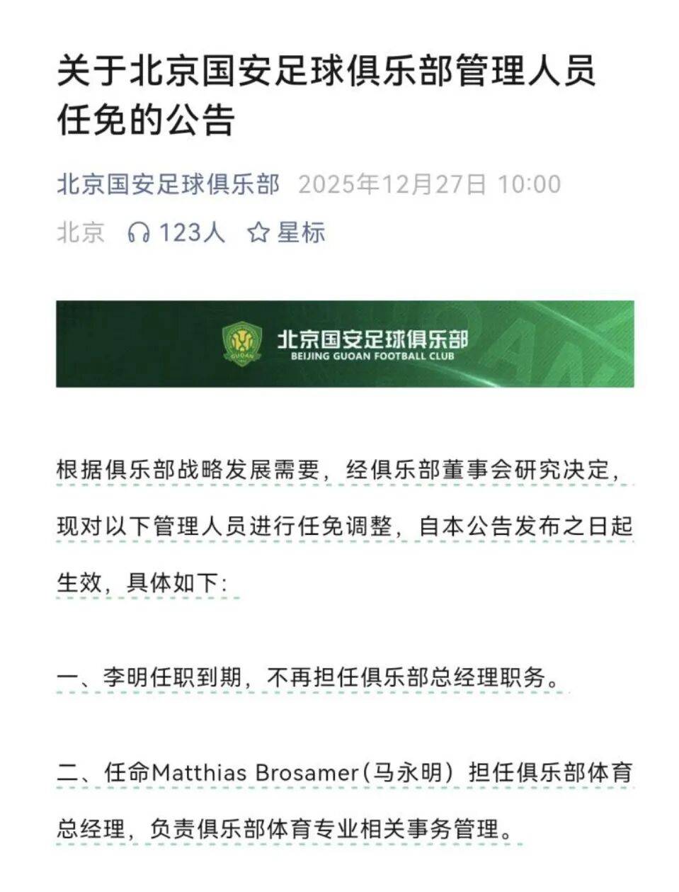 作为拥有超过15年足球领域专业经验的资深从业者,马永明的职业履历堪称亮眼。他曾任职于拜仁慕尼黑、斯图加特、弗赖堡等多家德甲顶尖俱乐部,既持有欧足联A级教练员证书,长期深耕U17、U19等青训梯队建设,在年轻球员发掘与培养方面经验丰富;也曾担任拜仁慕尼黑俱乐部亚洲体育总监长达六年,全面负责拜仁在亚洲的各项足球项目,成功推动金玟哉、刘邵子洋等中、日、韩球员登陆欧洲,并在中国助力建立多所足球学校,对欧洲先进职业俱乐部管理体系与中国、东亚地区足球联赛及青训体系均有着深刻洞察。而北语六年的求学经历赋予他的跨文化沟通能力与对中国社会的深刻理解,更成为他连接中外足球资源的独特优势,为其此次出任国安体育总经理、推动俱乐部专业化改革提供了关键助力。