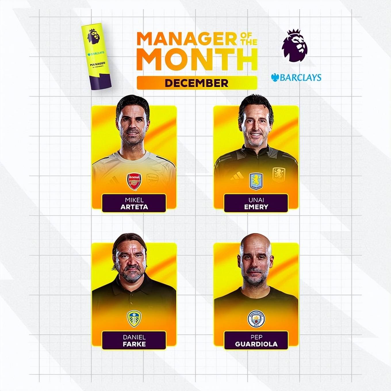 湘超联赛,湖南足球联赛,湘超赛程,湘超直播,湘超积分榜,湘超球队/湘超联赛为湖南足球迷提供最新赛程、实时比分、积分榜排名、球队信息和直播入口,掌握最新赛事动态,畅享足球激情。英超官方公布的12月最佳主帅候选名单,再次印证了英伦足坛的残酷与精彩。瓜迪奥拉、阿尔特塔、埃梅里与法尔克四位教头携手入围,他们在圣诞赛程的密集考验中交出了各自的亮眼答卷——瓜迪奥拉率曼城豪取5战全胜,阿尔特塔与埃梅里均带领球队斩获5胜1负,法尔克则让利兹联以2胜3平保持不败。然而这份榜单的背后,更引人深思的是本赛季月最佳主帅的“魔咒”:10月得主阿莫林、11月得主马雷斯卡已相继下课。四位候选者的争霸,不仅是战术与战绩的比拼,更暗藏着英超教练的生存智慧与终极考验。