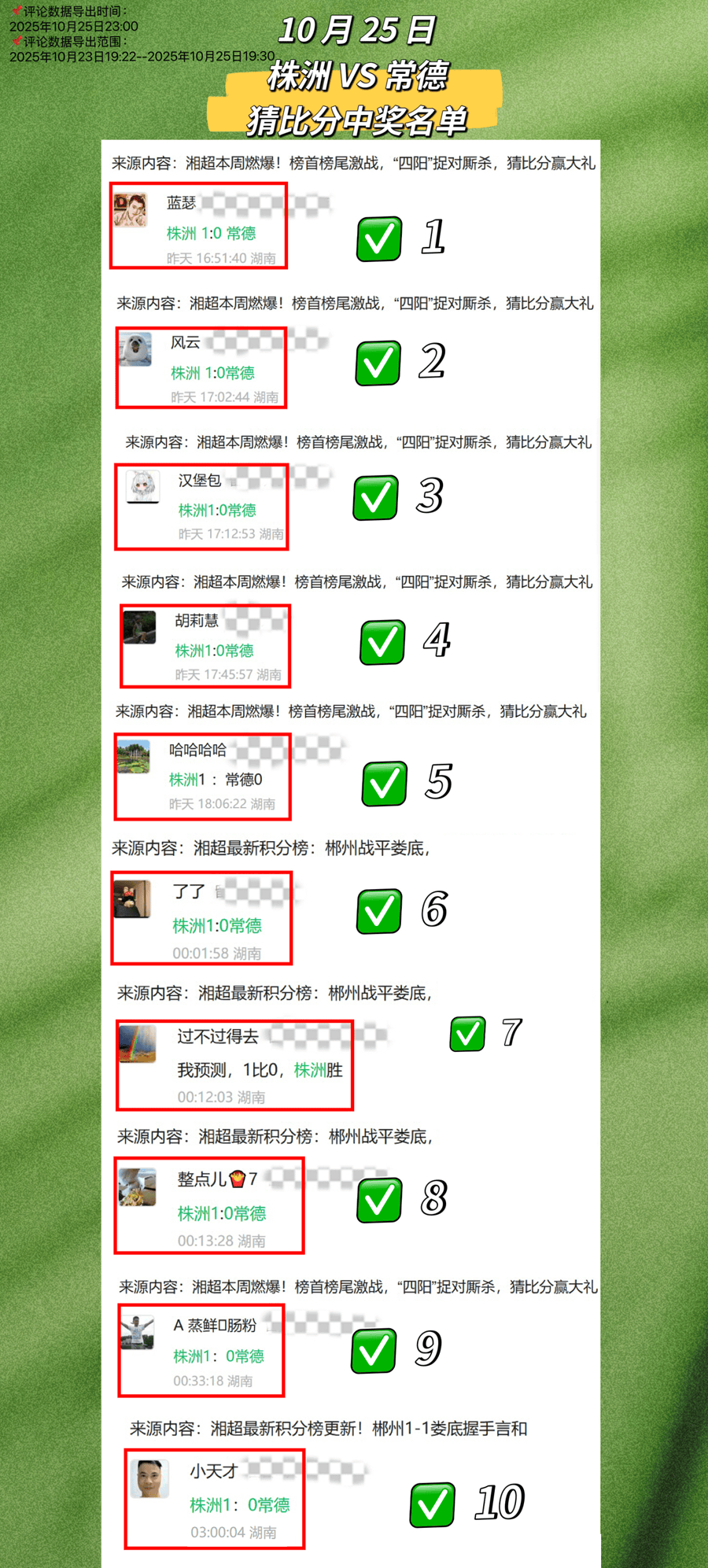 湘超联赛,湖南足球联赛,湘超赛程,湘超直播,湘超积分榜,湘超球队/湘超联赛为湖南足球迷提供最新赛程、实时比分、积分榜排名、球队信息和直播入口,掌握最新赛事动态,畅享足球激情。10月25日“湘超”株洲vs常德猜比分活动,前10名获奖者名单见下图,恭喜各位幸运宝宝!