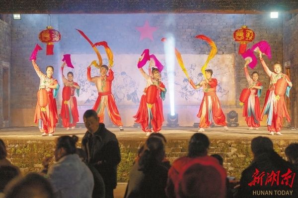 暮色四合,古戏台下,村民和游客搬来木板凳围坐在火炉旁,茶陵湘剧保护传承中心的原创剧《湾里红》,在掌声中拉开帷幕。