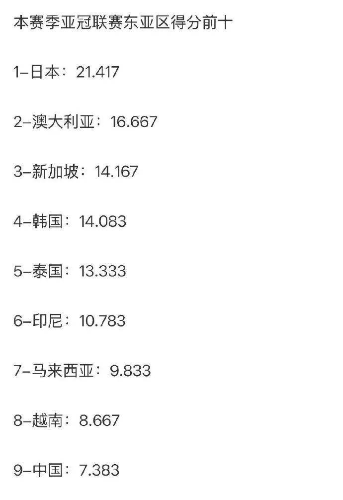 这使得中超在东亚区的技术积分仅排名第9,落后于泰国、印尼、马来西亚、越南以及新加坡等邻近国家的联赛,综合排名甚至下滑至第15名,仅比排在第16位的柬埔寨多不到1分。亚足联积分榜上,中超凭借49.483分位列第8名,而距离排名第7位的泰国联赛还有明显差距,同时也只领先澳大利亚联赛约1.3分。如果澳超联赛在未来赛事中持续提升实力并超过中超,将直接导致2027-28赛季中超只能获得亚冠精英联赛与亚冠二级联赛各一个参赛名额,且将失去争夺亚冠精英联赛附加赛门票的资格。